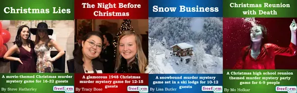 On my Christmas murder mystery games page, I talk about three games with a specific Christmas theme (and a fourth set in a snowed-in ski chalet that could easily be set at Christmas).