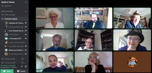 Death on Venice comes with detailed instructions for using Google Hangouts, but you can use almost any online video chat service: Zoom, MS Teams, Google Meet. I used Discord, a service set up for gamers. I used Discord because it allows you to create separate rooms really easy (like breakout rooms in Zoom) and the players can move themselves between the rooms (rather than require the host to do it like Zoom).
